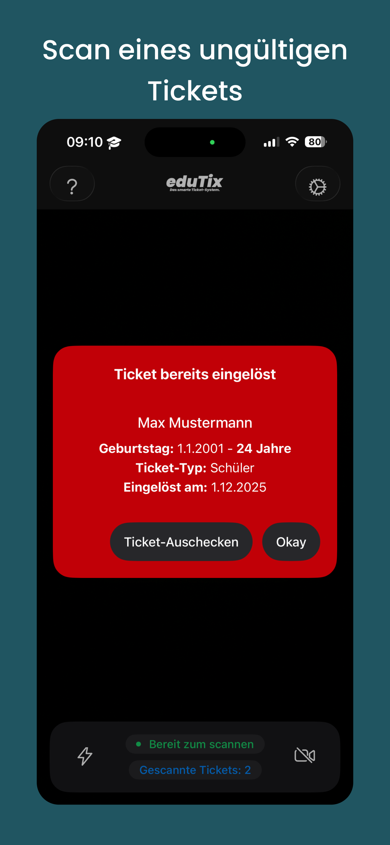 V2.0.1In der neuen Version ist es nun möglich bereits eingescannte Tickets auszuchecken und sie erneut einscannbar zu machen: